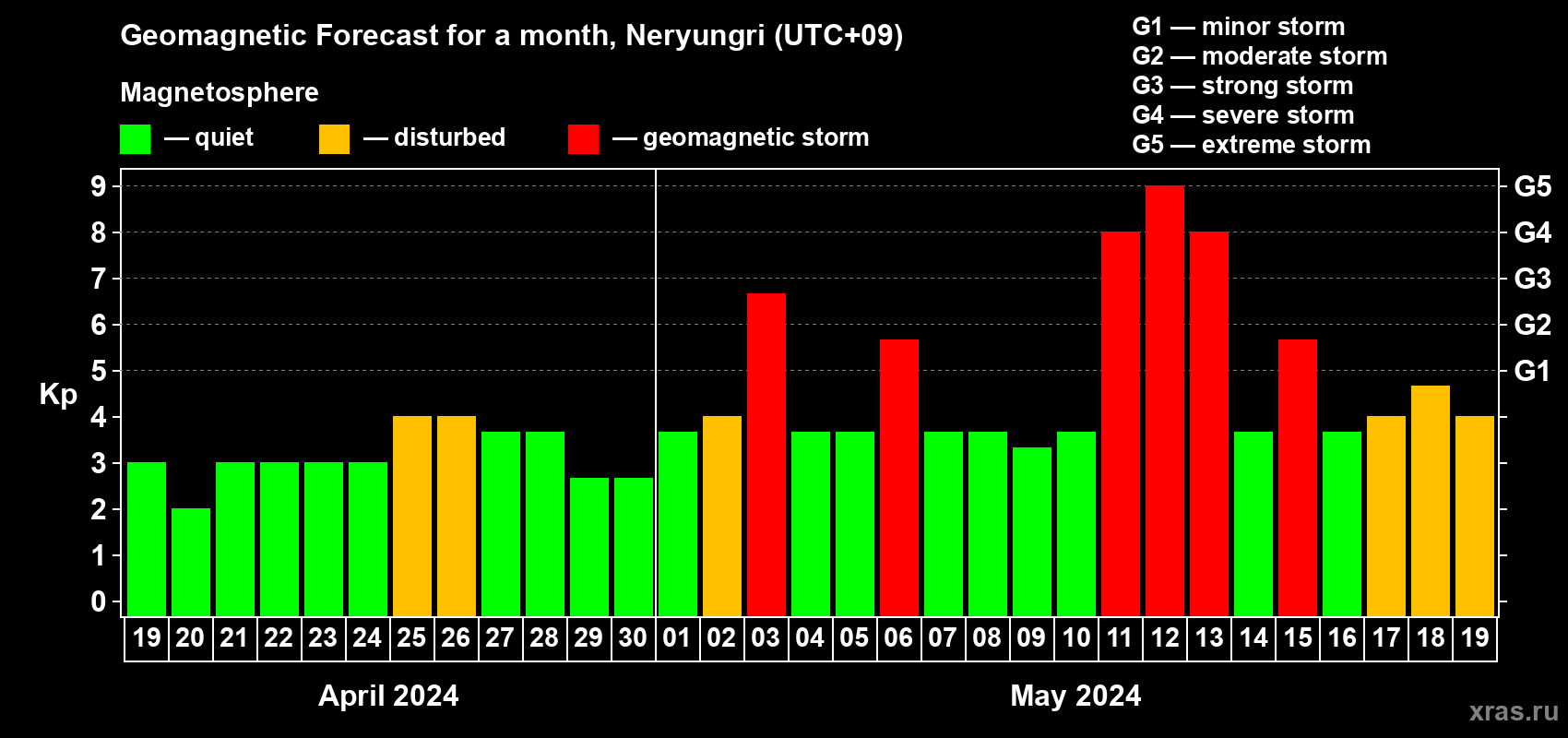 Geomagnetic storm forecast in Neryungri for Apr 19, 2024