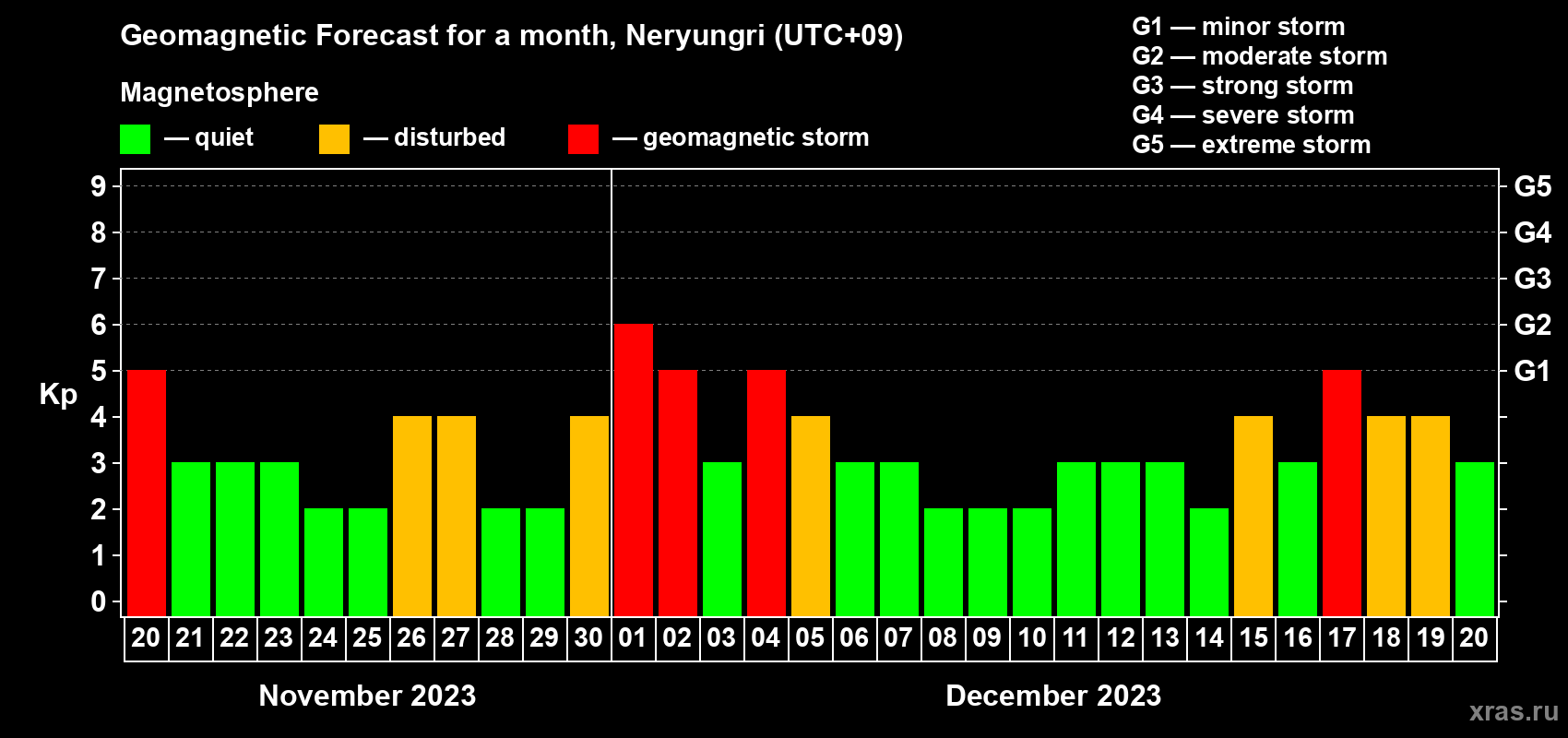 Geomagnetic storm forecast in Neryungri for Nov 20, 2023