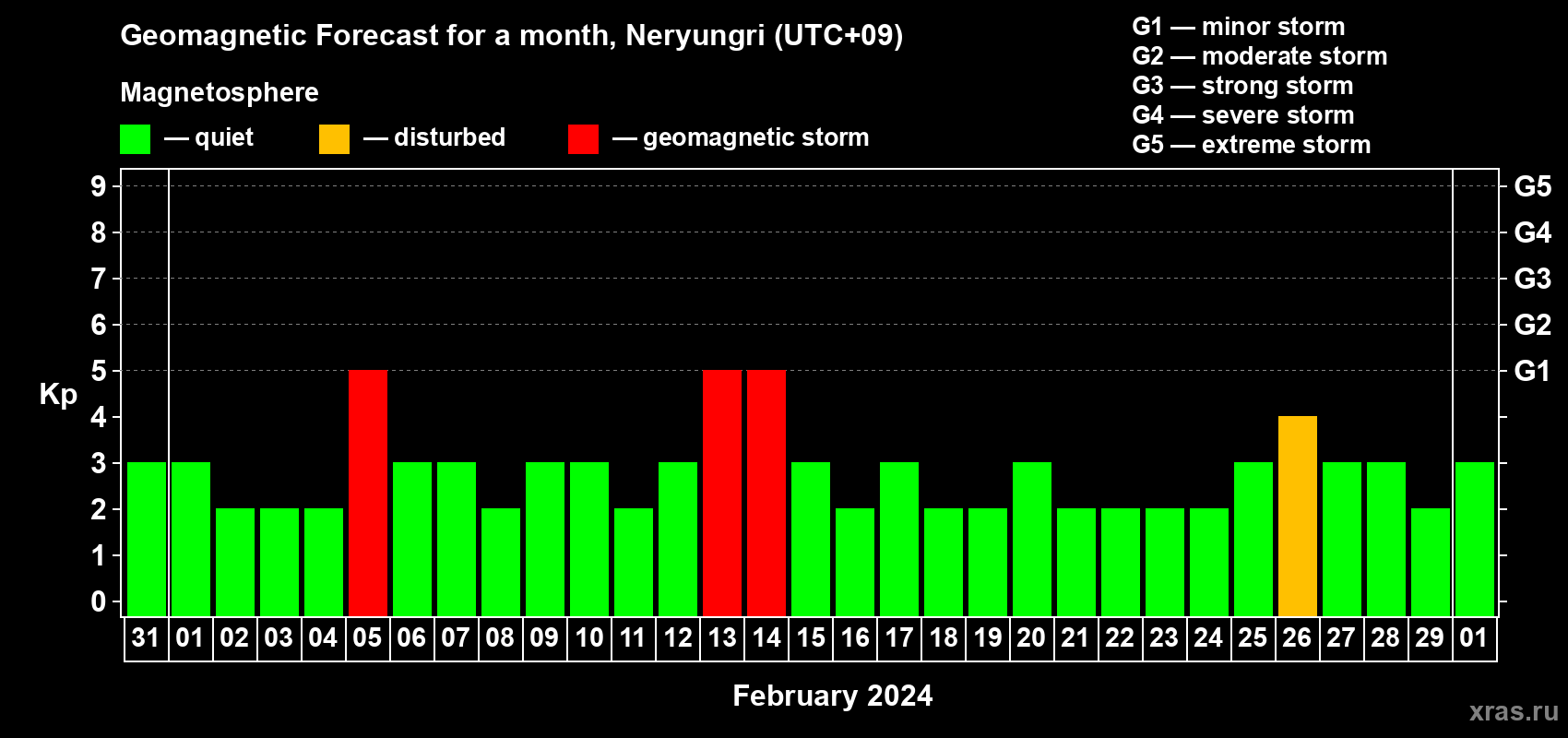 Geomagnetic storm forecast in Neryungri for Jan 31, 2024