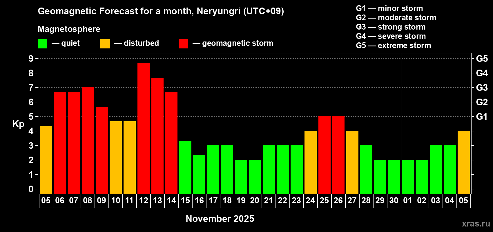 Geomagnetic storm forecast in Neryungri for Nov 05, 2025