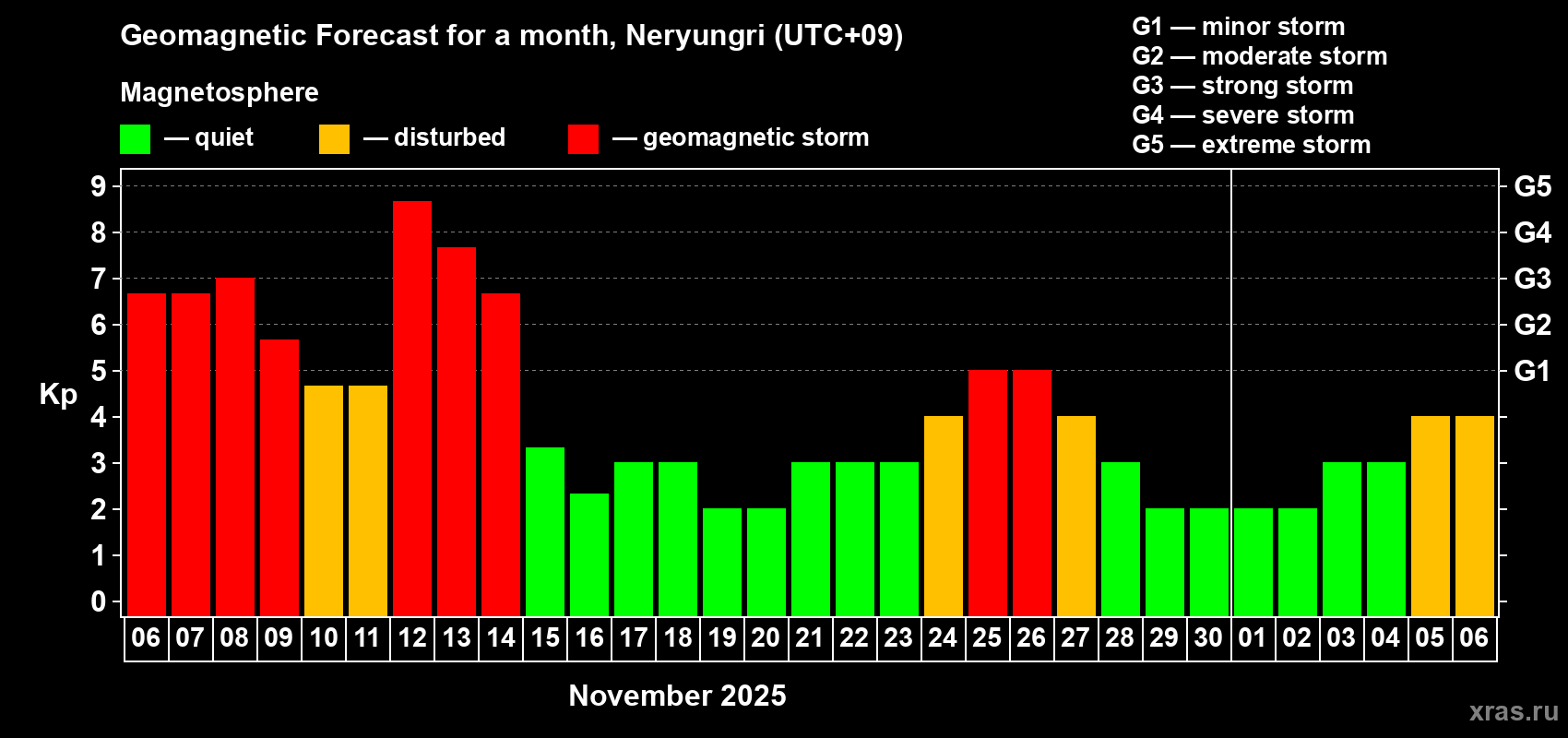 Geomagnetic storm forecast in Neryungri for Nov 06, 2025