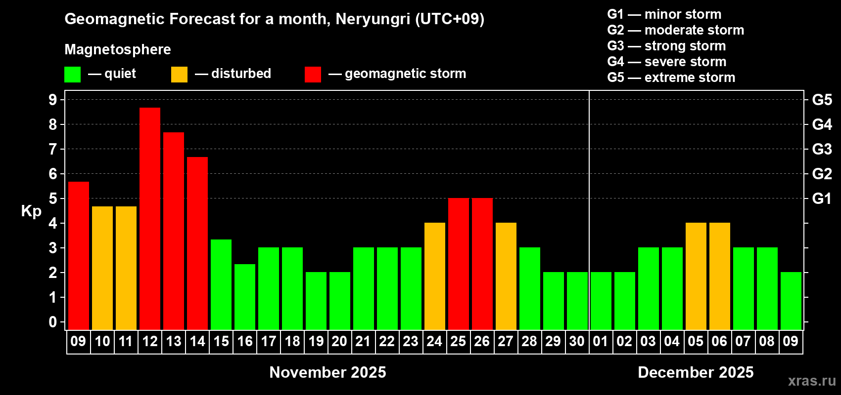 Geomagnetic storm forecast in Neryungri for Nov 09, 2025
