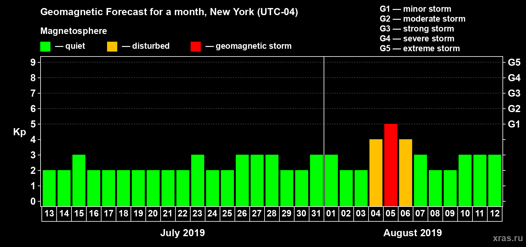 Geomagnetic storm forecast in New York for Jul 13, 2019