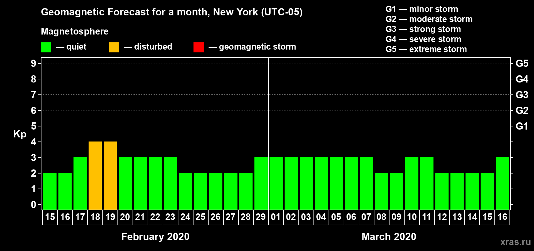 Geomagnetic storm forecast in New York for Feb 15, 2020