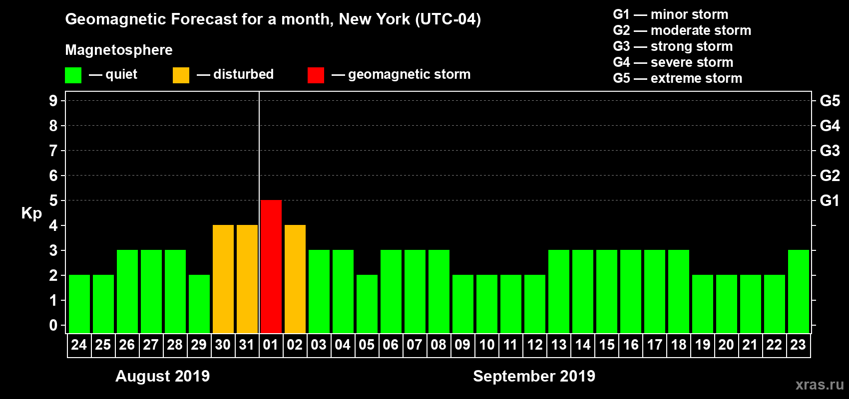 Geomagnetic storm forecast in New York for Aug 24, 2019