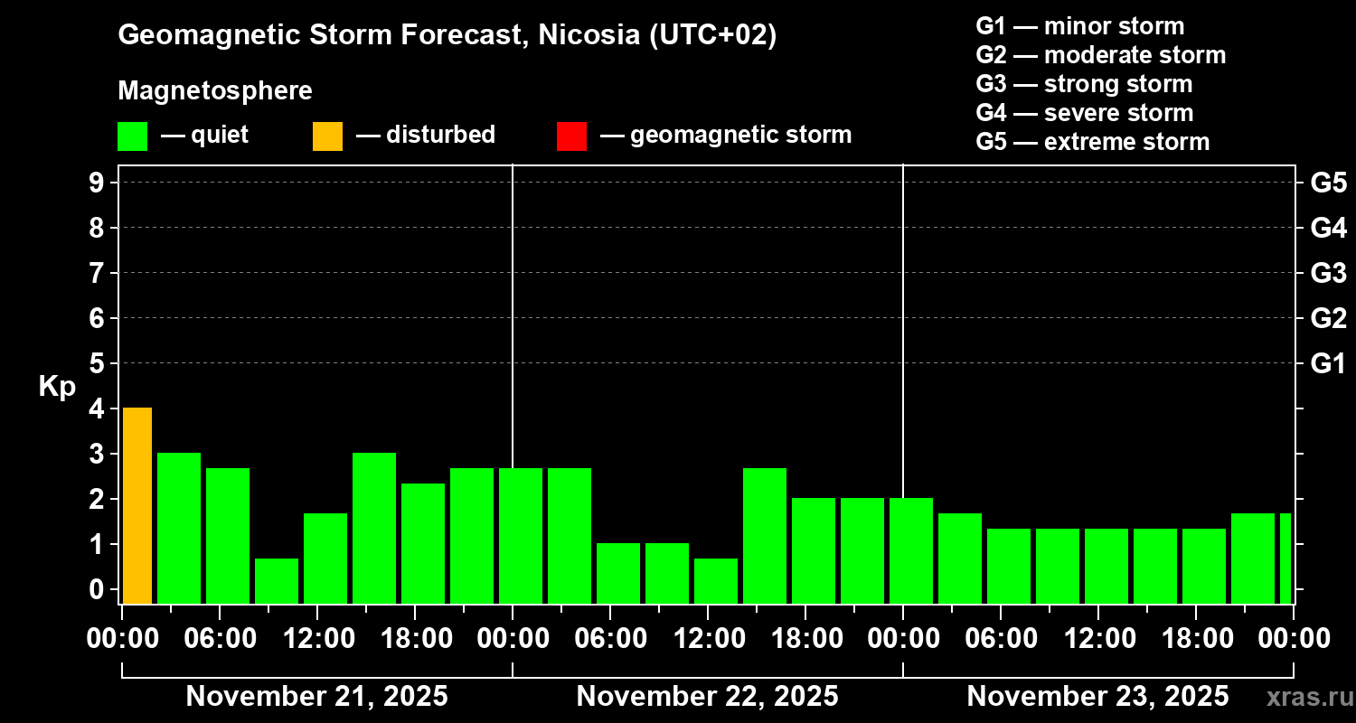 Geomagnetic storm forecast in Nicosia for Nov 21, 2025