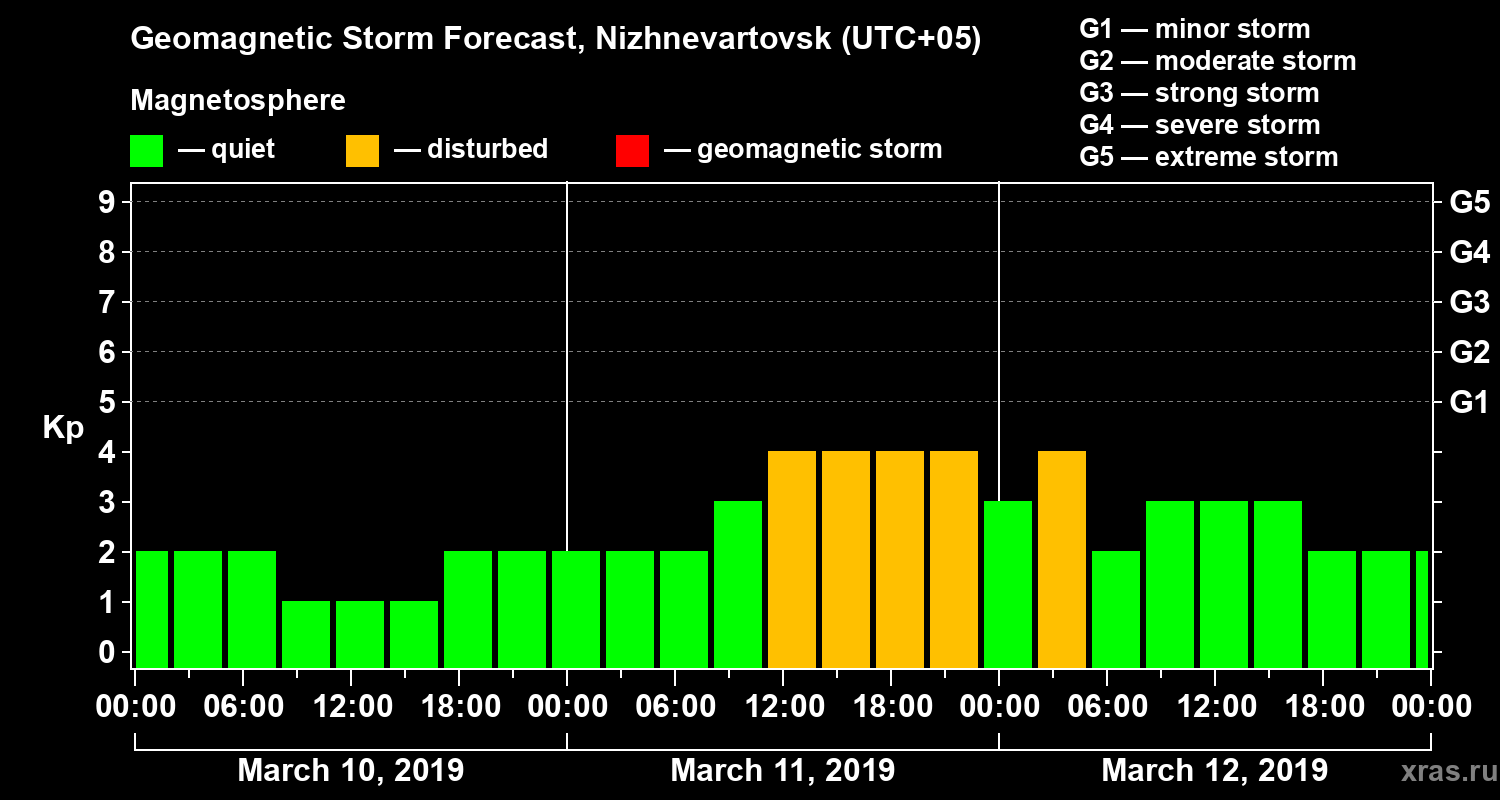 Geomagnetic storm forecast in Nizhnevartovsk for Mar 10, 2019