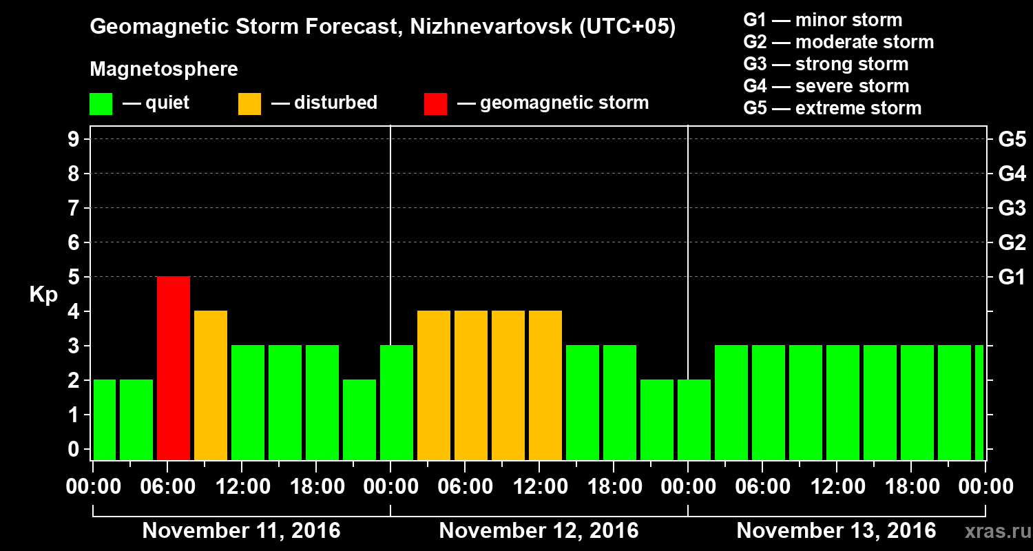Geomagnetic storm forecast in Nizhnevartovsk for Nov 11, 2016