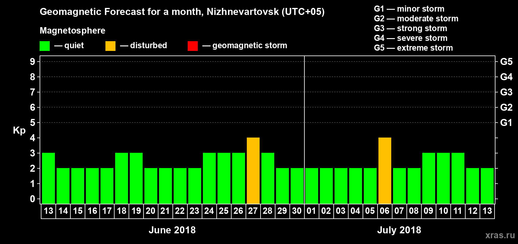 Geomagnetic storm forecast in Nizhnevartovsk for Jun 13, 2018