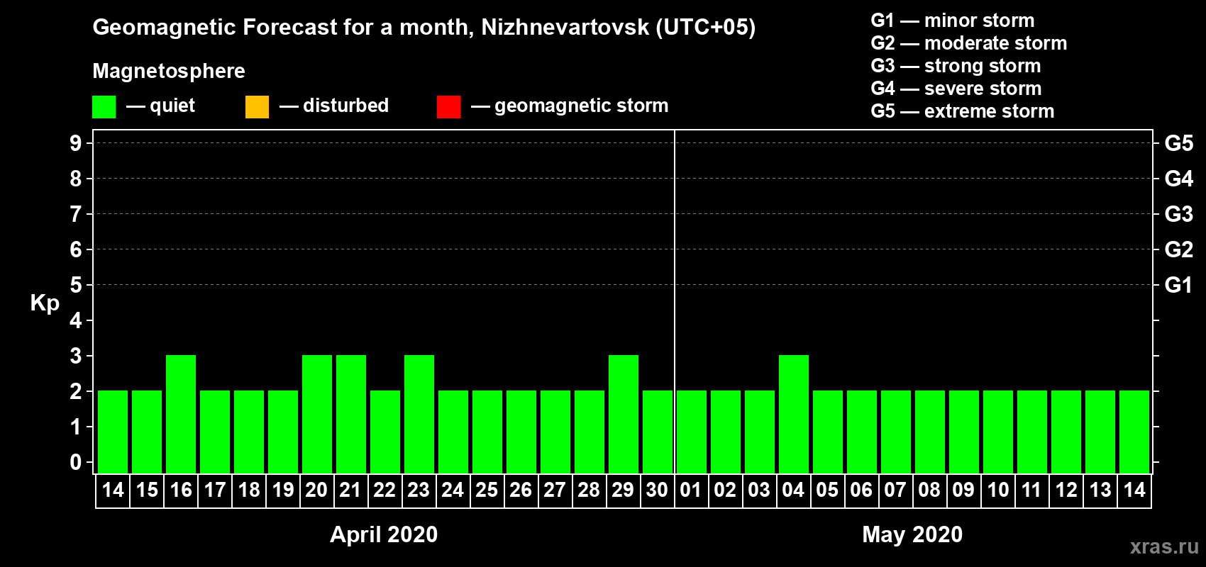 Geomagnetic storm forecast in Nizhnevartovsk for Apr 14, 2020