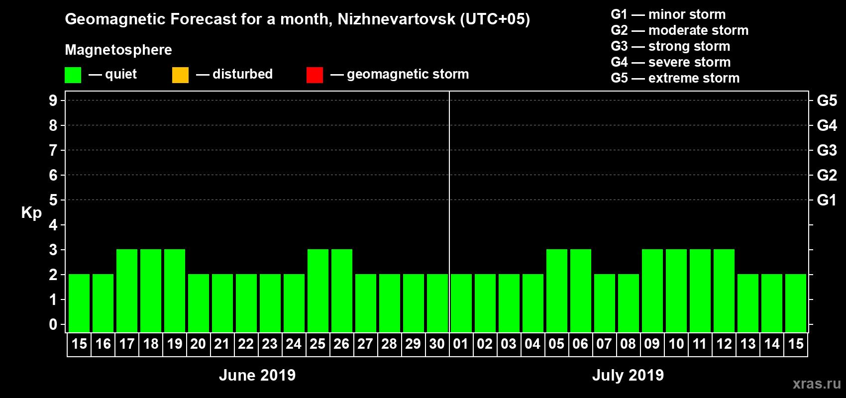Geomagnetic storm forecast in Nizhnevartovsk for Jun 15, 2019