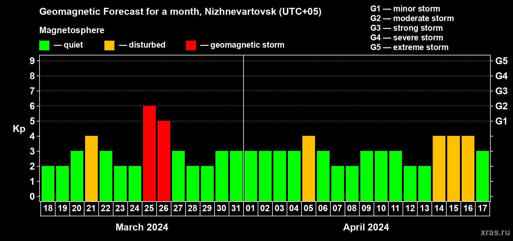 Geomagnetic activity forecast in Nizhnevartovsk — Mar 18, 2024