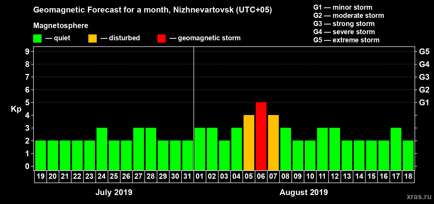 Geomagnetic storm forecast in Nizhnevartovsk for Jul 19, 2019