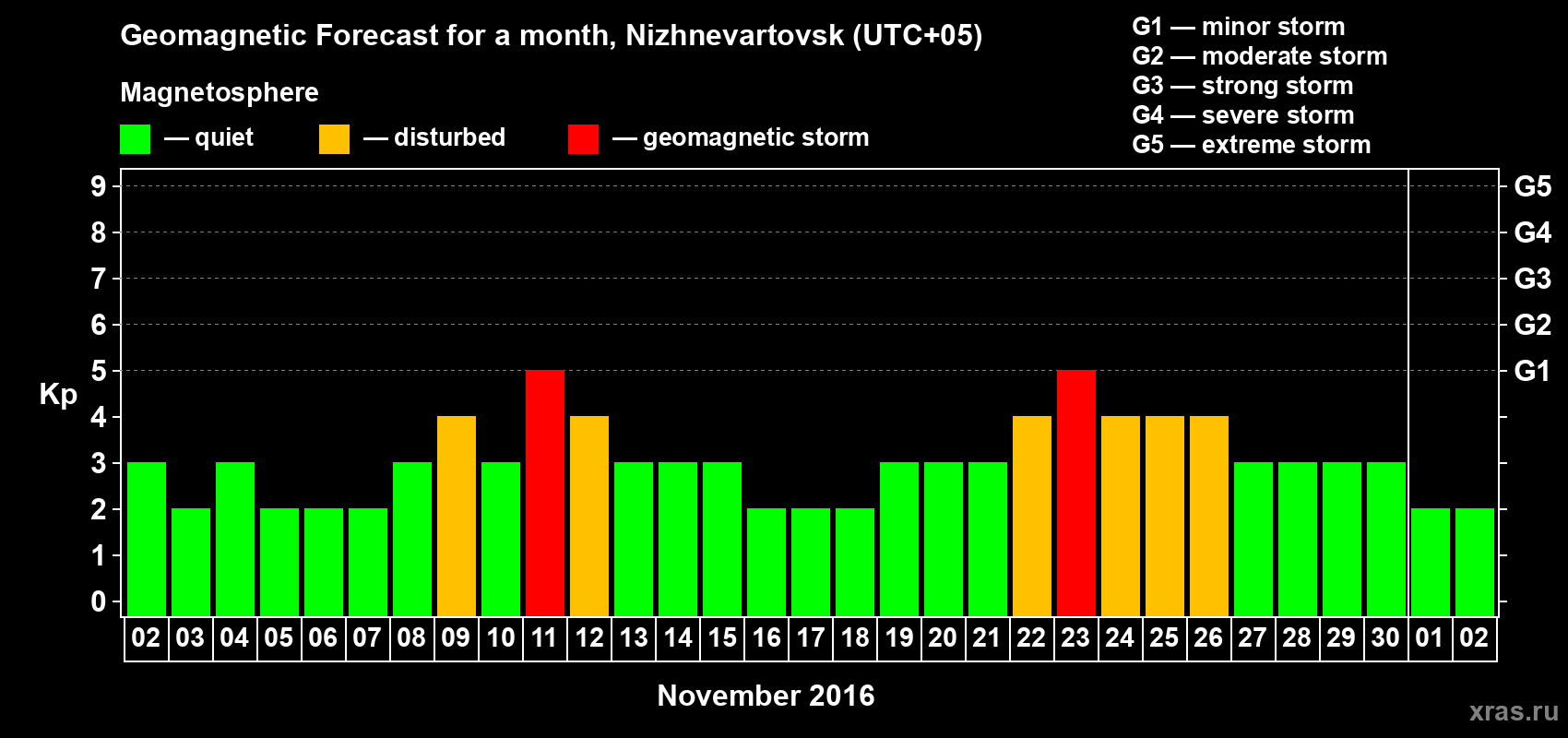 Geomagnetic storm forecast in Nizhnevartovsk for Nov 02, 2016