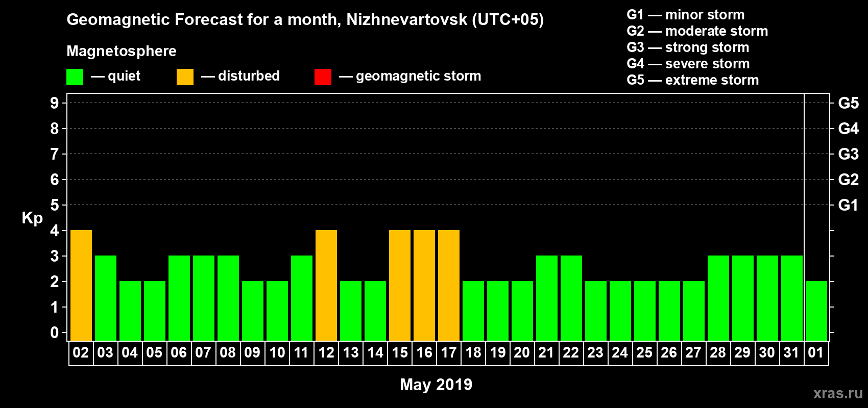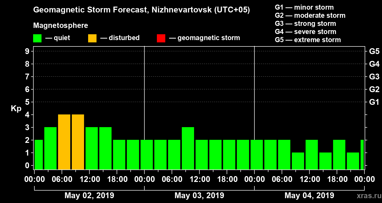 Geomagnetic activity forecast in Nizhnevartovsk — May 02, 2019