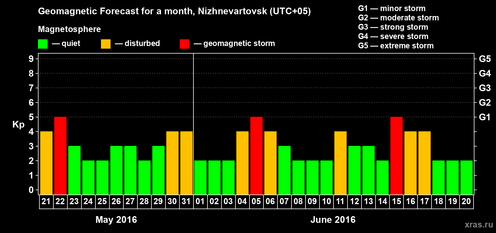 Geomagnetic activity forecast in Nizhnevartovsk — May 21, 2016