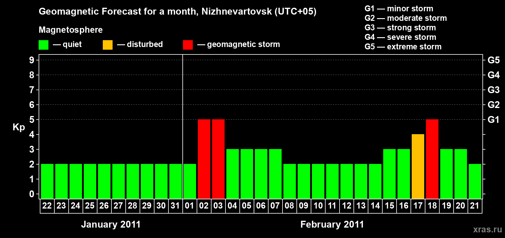 Geomagnetic storm forecast in Nizhnevartovsk for Jan 22, 2011