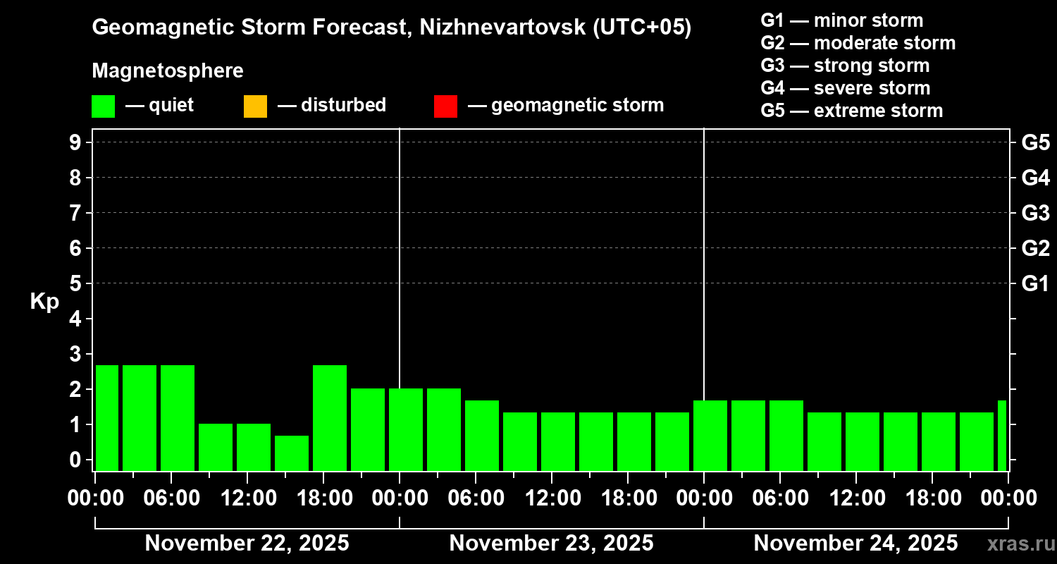 Geomagnetic activity forecast in Nizhnevartovsk — Nov 22, 2025