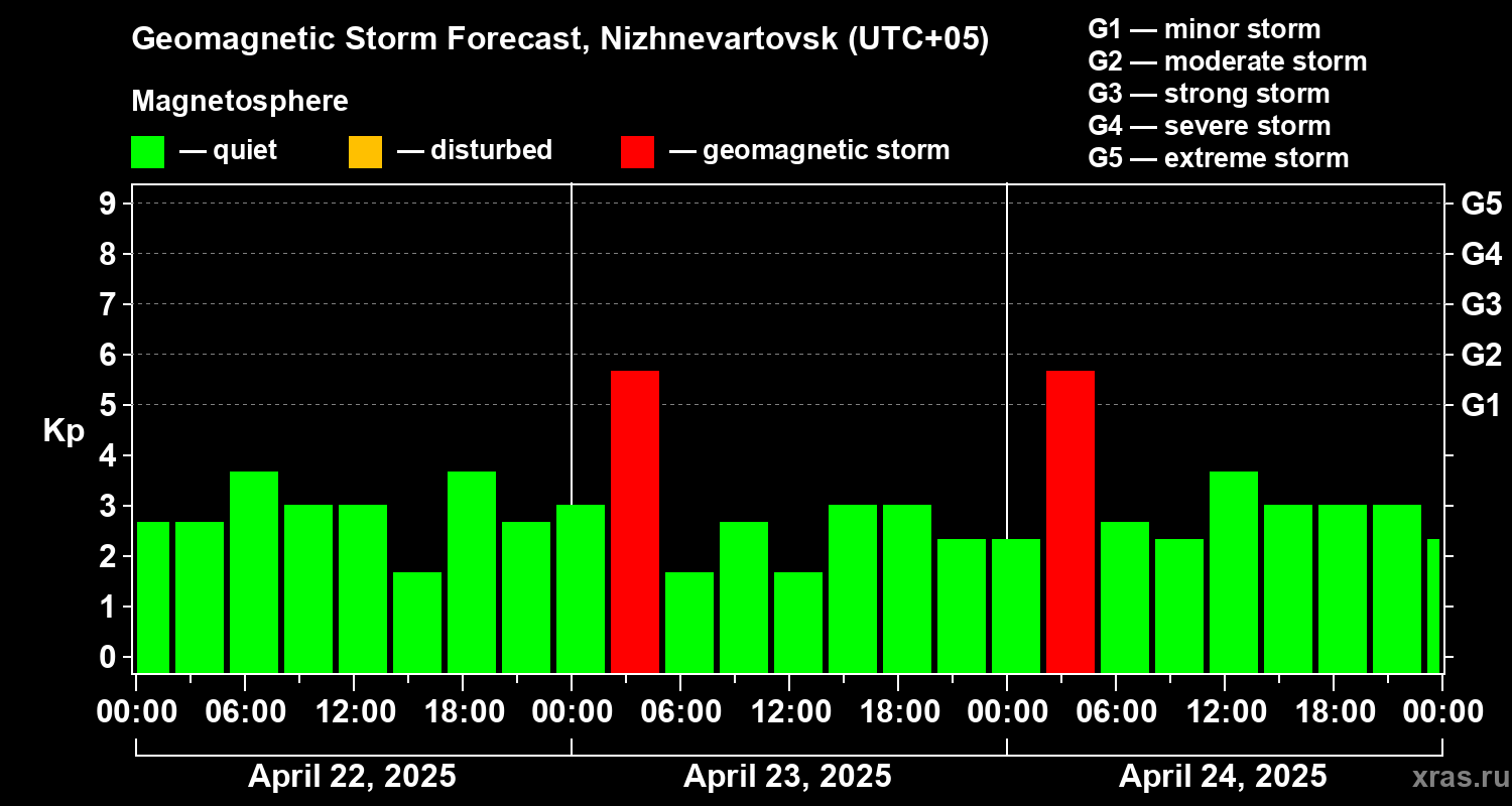 Geomagnetic storm forecast in Nizhnevartovsk for Apr 22, 2025