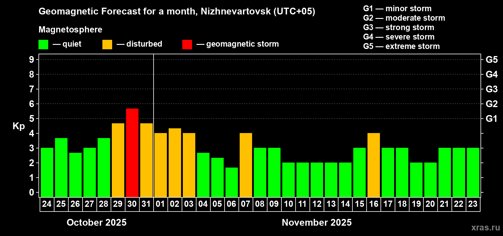 Geomagnetic storm forecast in Nizhnevartovsk for Oct 24, 2025