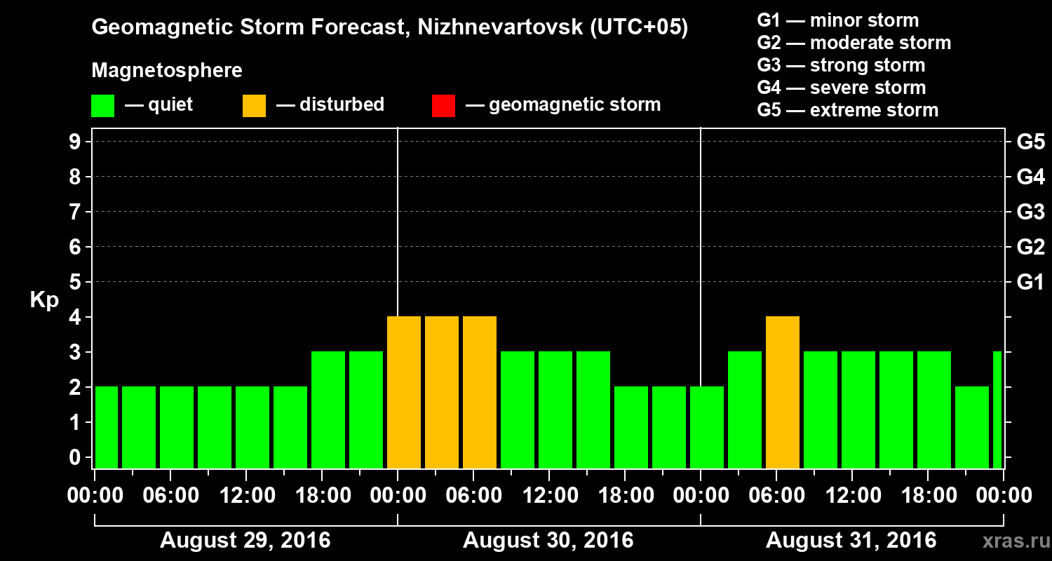 Geomagnetic storm forecast in Nizhnevartovsk for Aug 29, 2016
