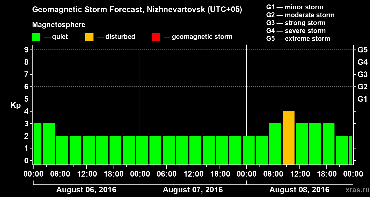 Geomagnetic storm forecast in Nizhnevartovsk for Aug 06, 2016