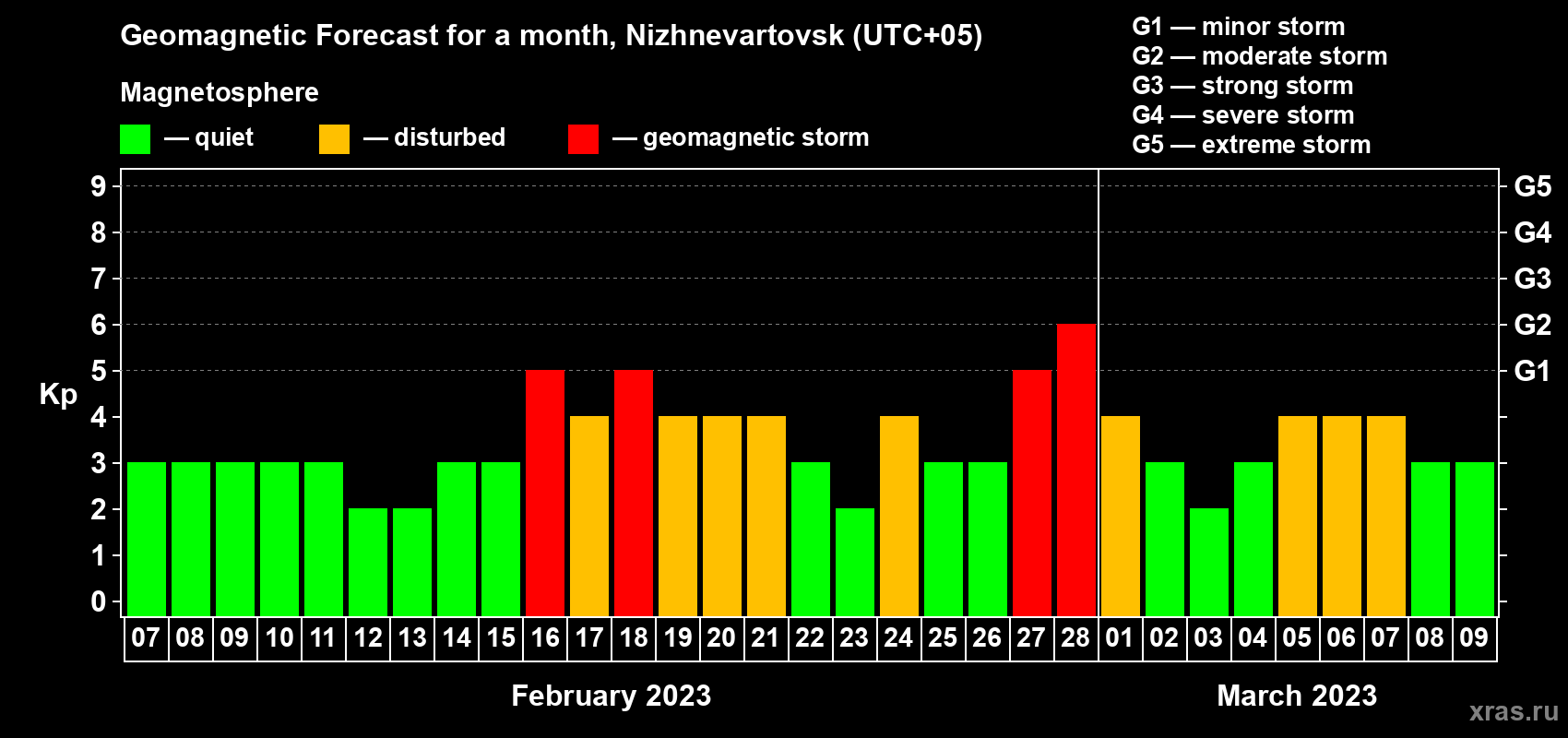 Geomagnetic storm forecast in Nizhnevartovsk for Feb 07, 2023