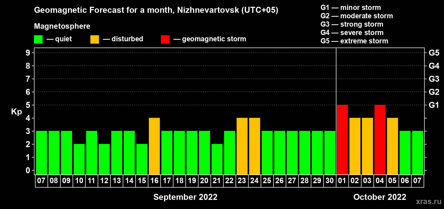 Geomagnetic storm forecast in Nizhnevartovsk for Sep 07, 2022