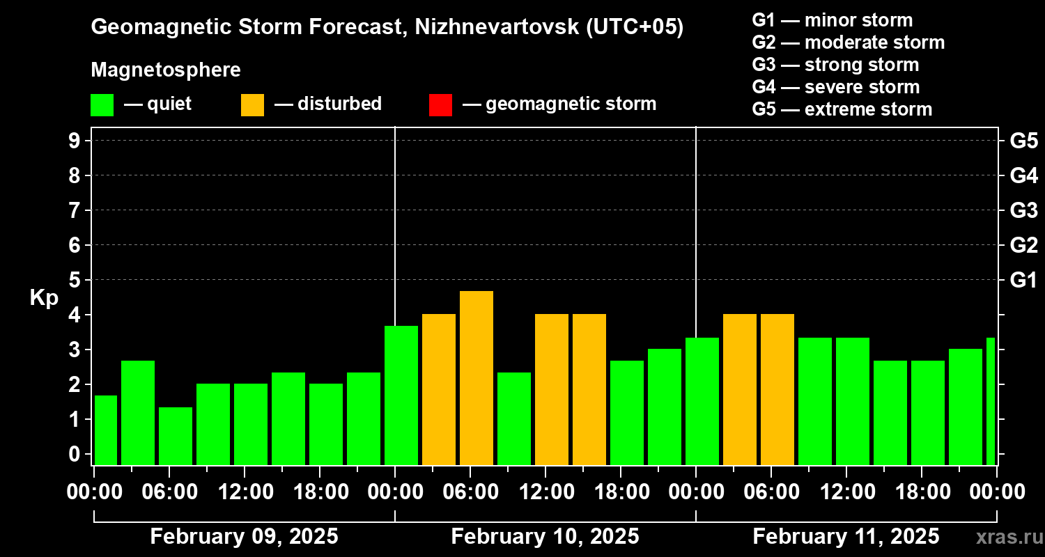 Geomagnetic storm forecast in Nizhnevartovsk for Feb 09, 2025