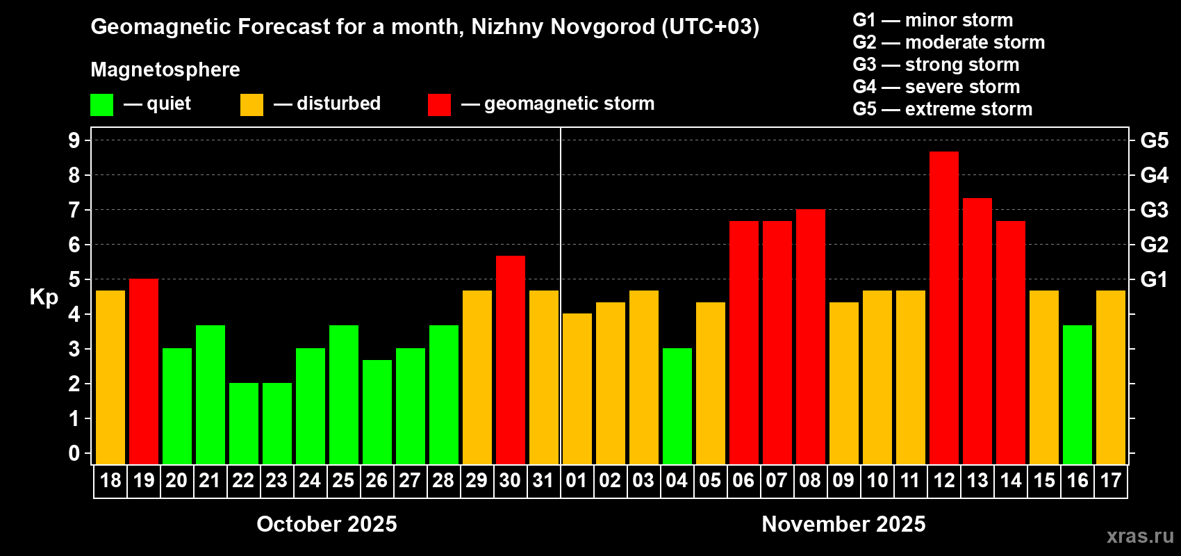 Geomagnetic storm forecast in Nizhny Novgorod for Oct 18, 2025