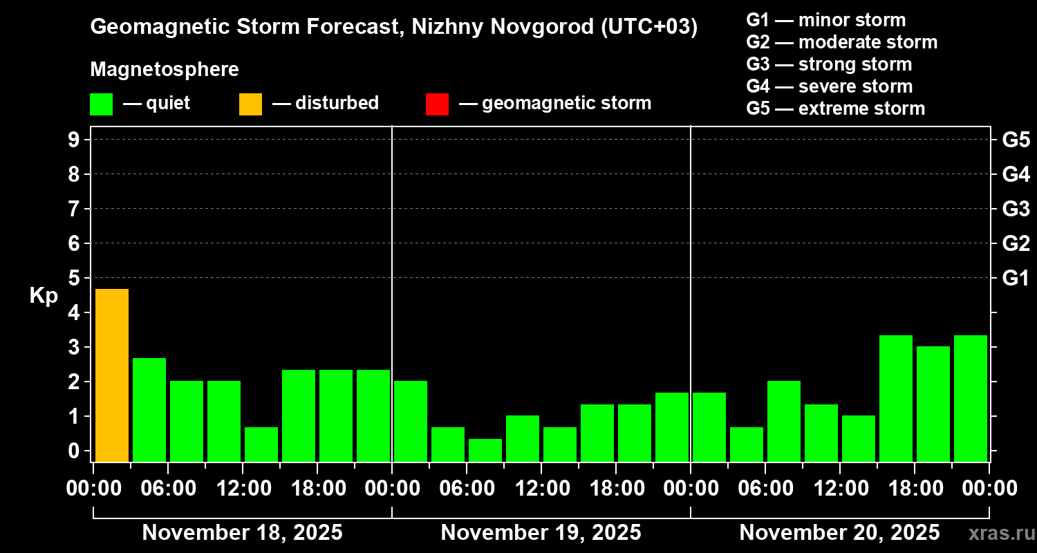 Geomagnetic storm forecast in Nizhny Novgorod for Nov 18, 2025