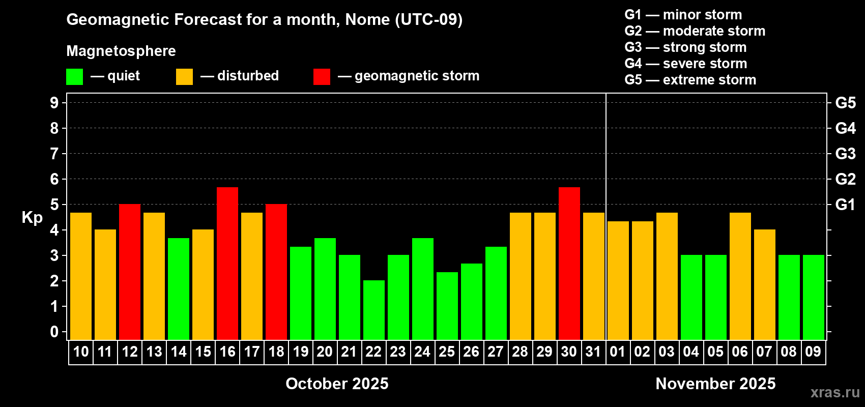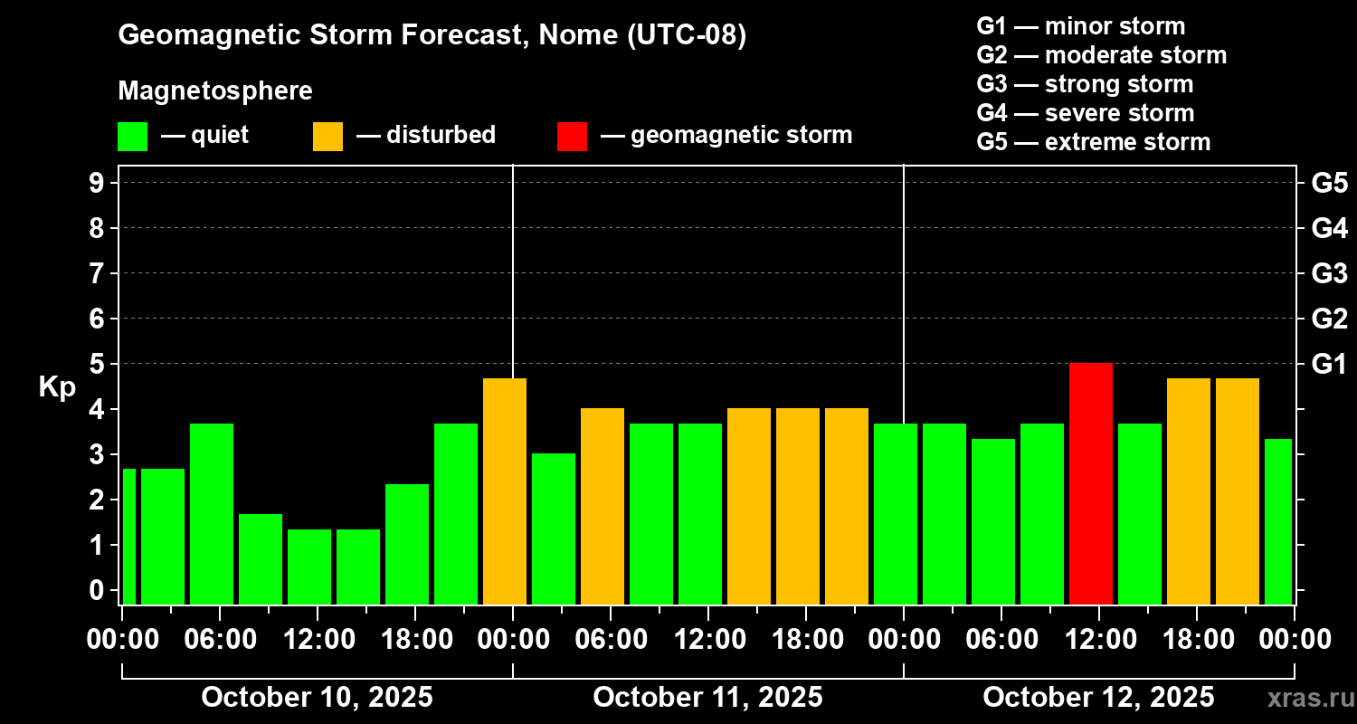 Geomagnetic storm forecast in Nome for Oct 10, 2025