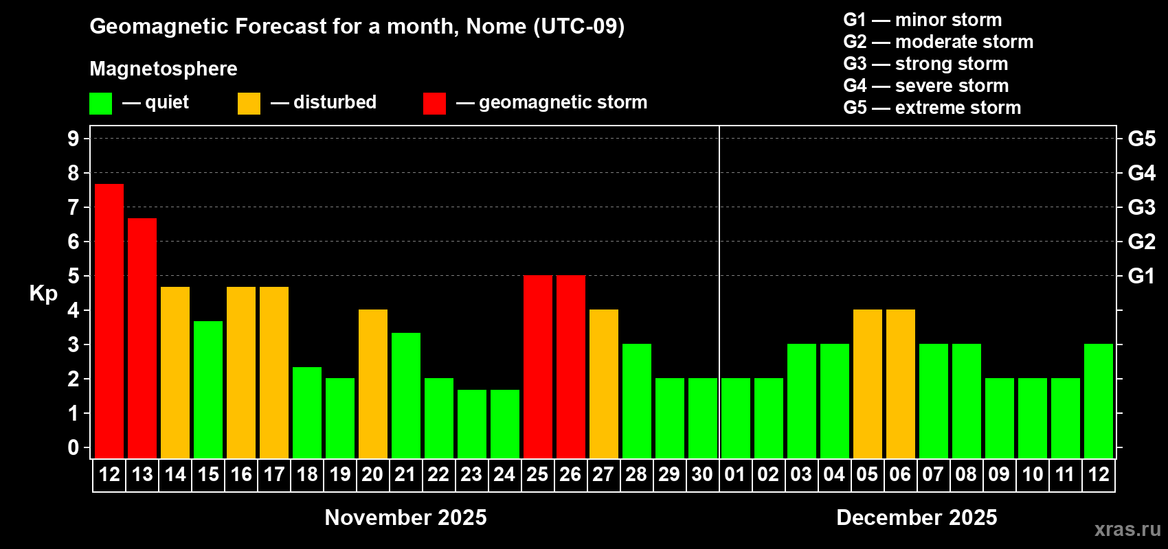 Geomagnetic storm forecast in Nome for Nov 12, 2025