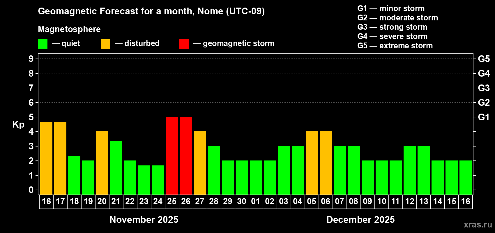Geomagnetic storm forecast in Nome for Nov 16, 2025