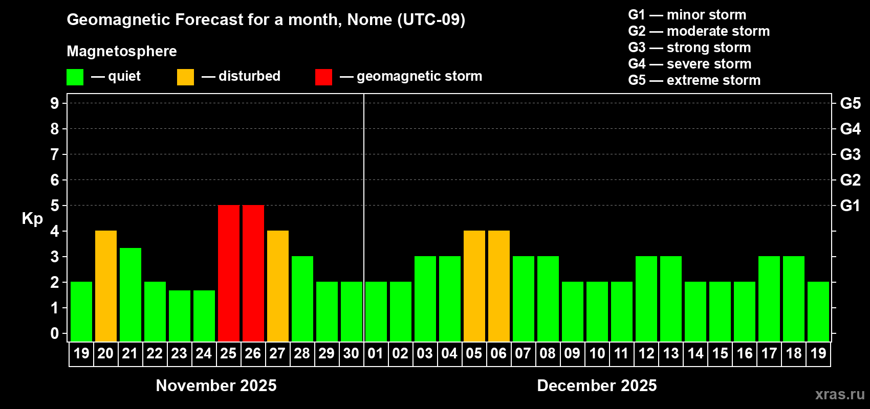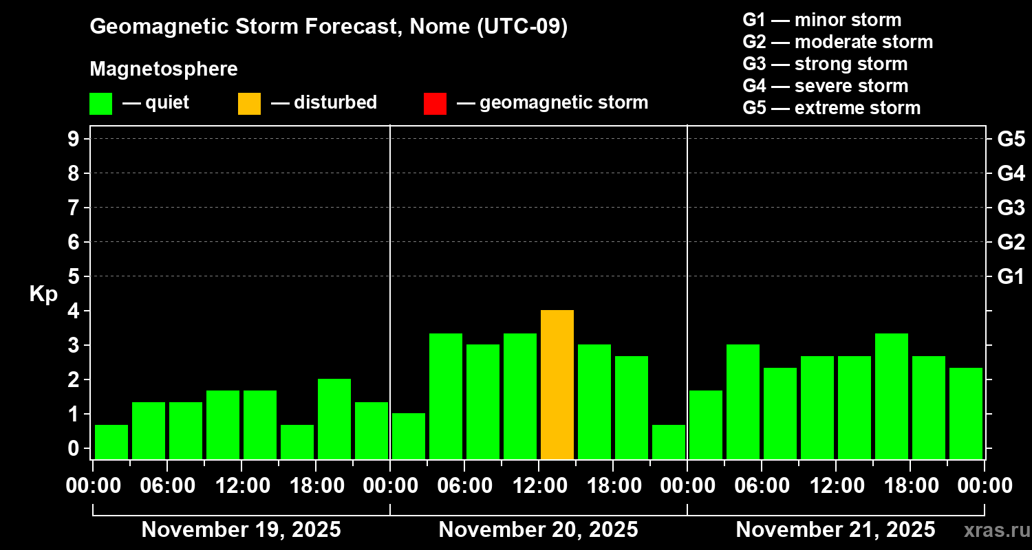 Geomagnetic storm forecast in Nome for Nov 19, 2025