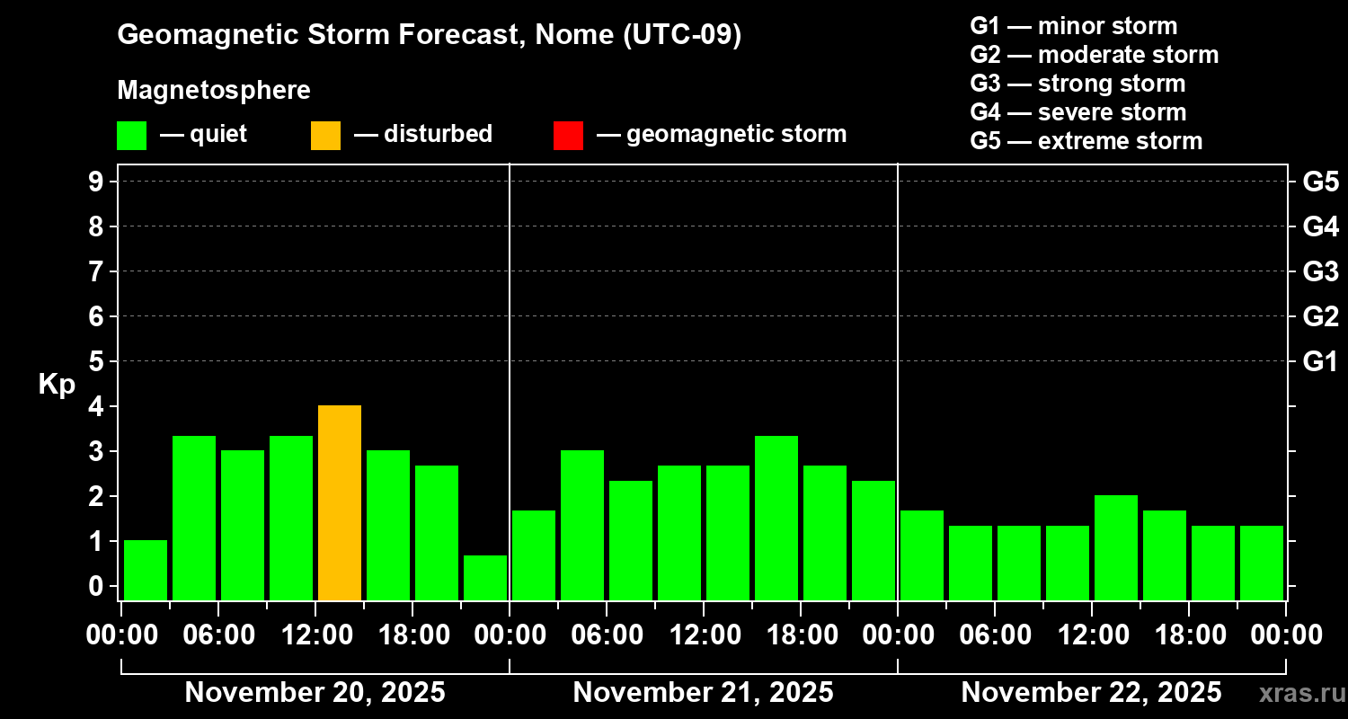 Geomagnetic storm forecast in Nome for Nov 20, 2025