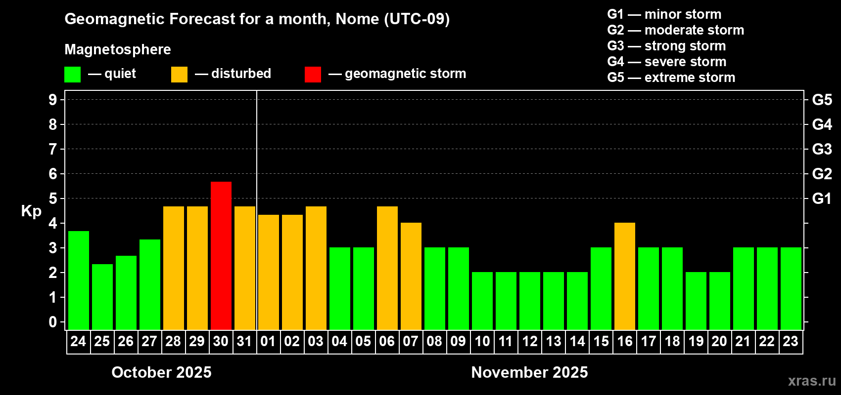 Geomagnetic storm forecast in Nome for Oct 24, 2025