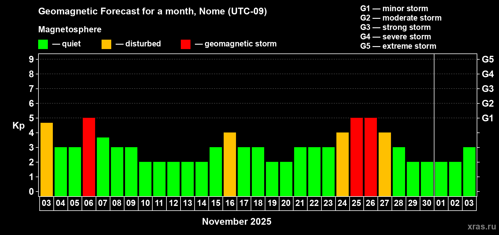Geomagnetic storm forecast in Nome for Nov 03, 2025
