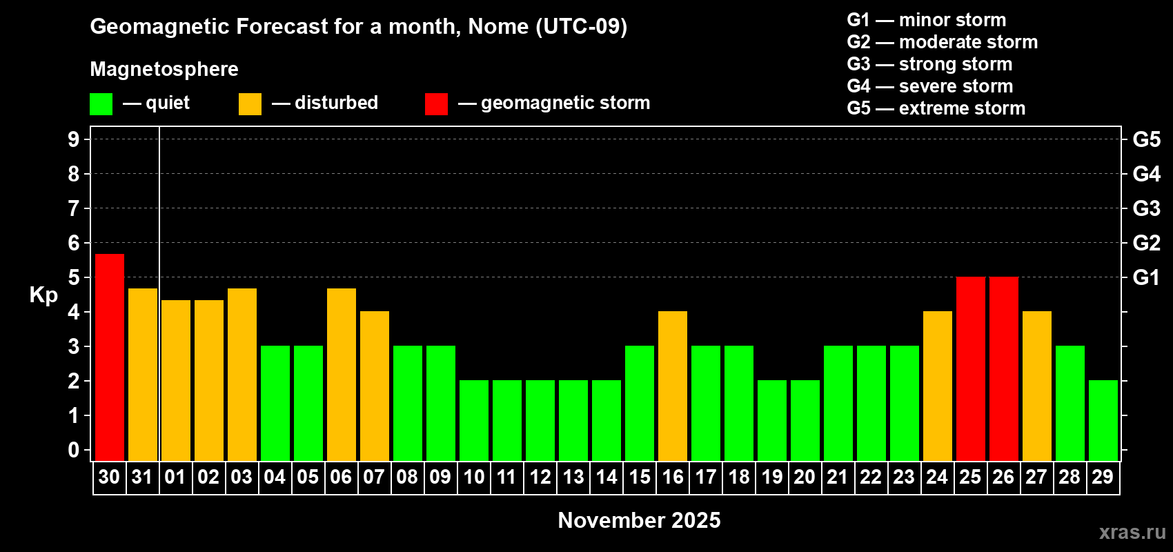 Geomagnetic storm forecast in Nome for Oct 30, 2025