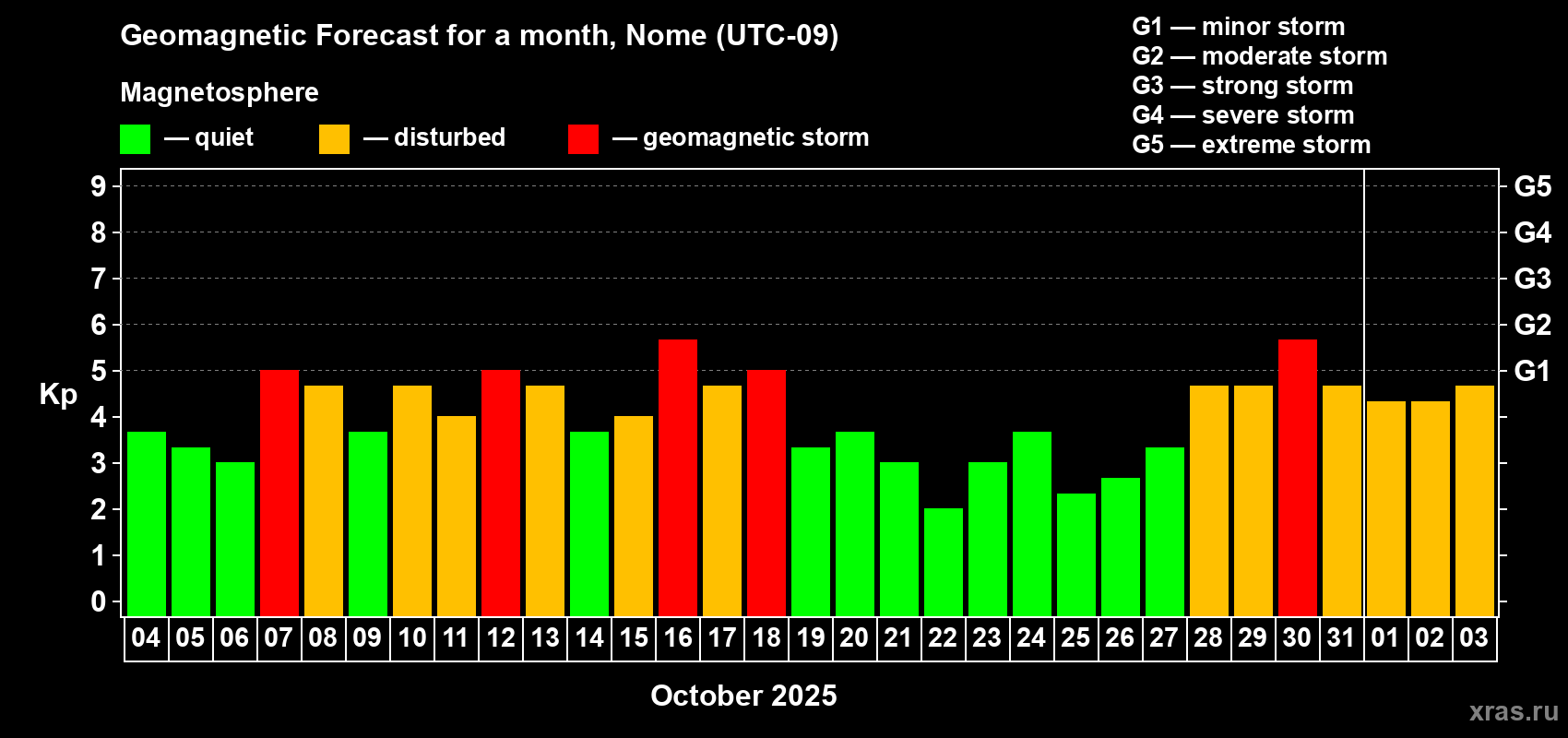 Geomagnetic storm forecast in Nome for Oct 04, 2025