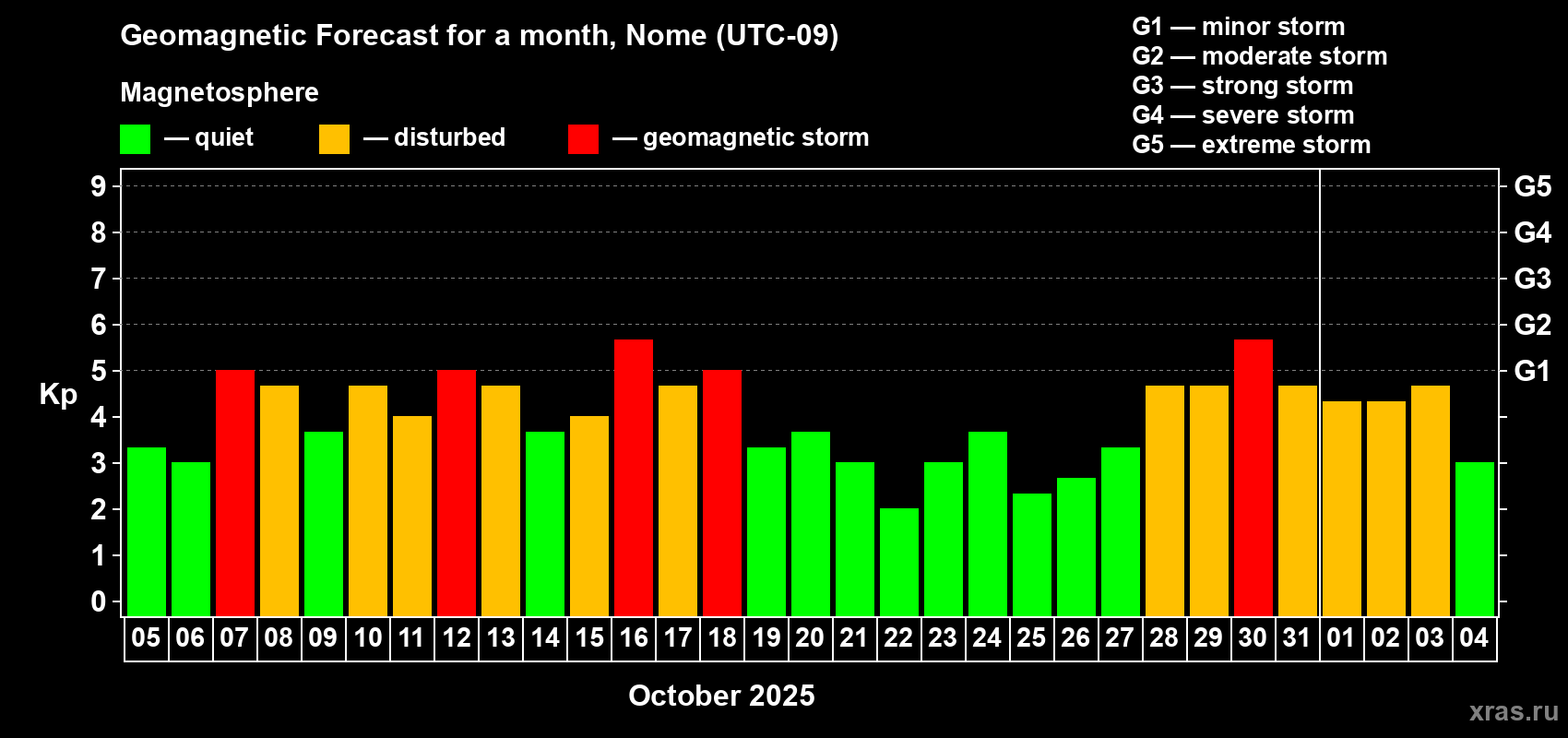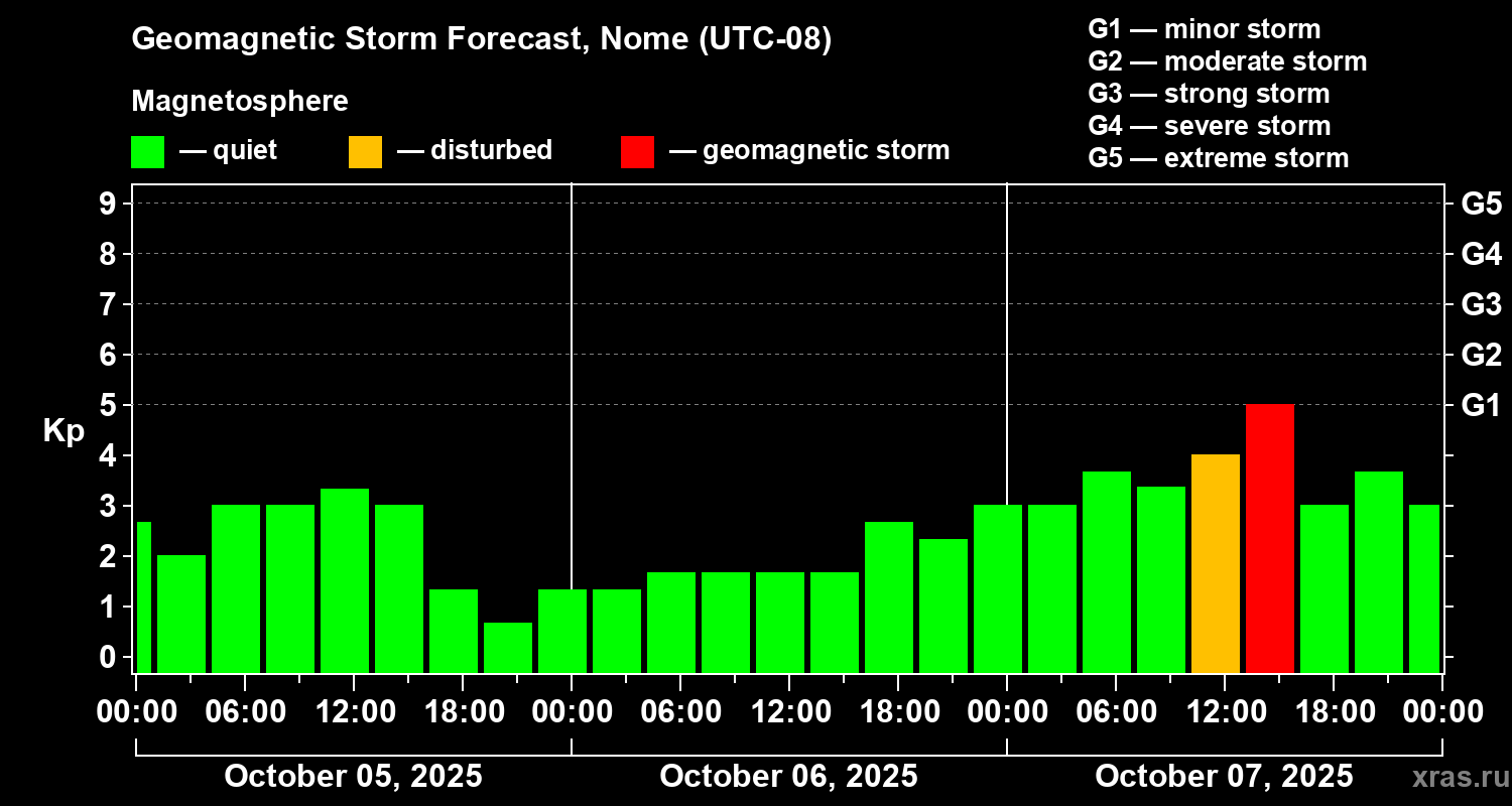Geomagnetic storm forecast in Nome for Oct 05, 2025