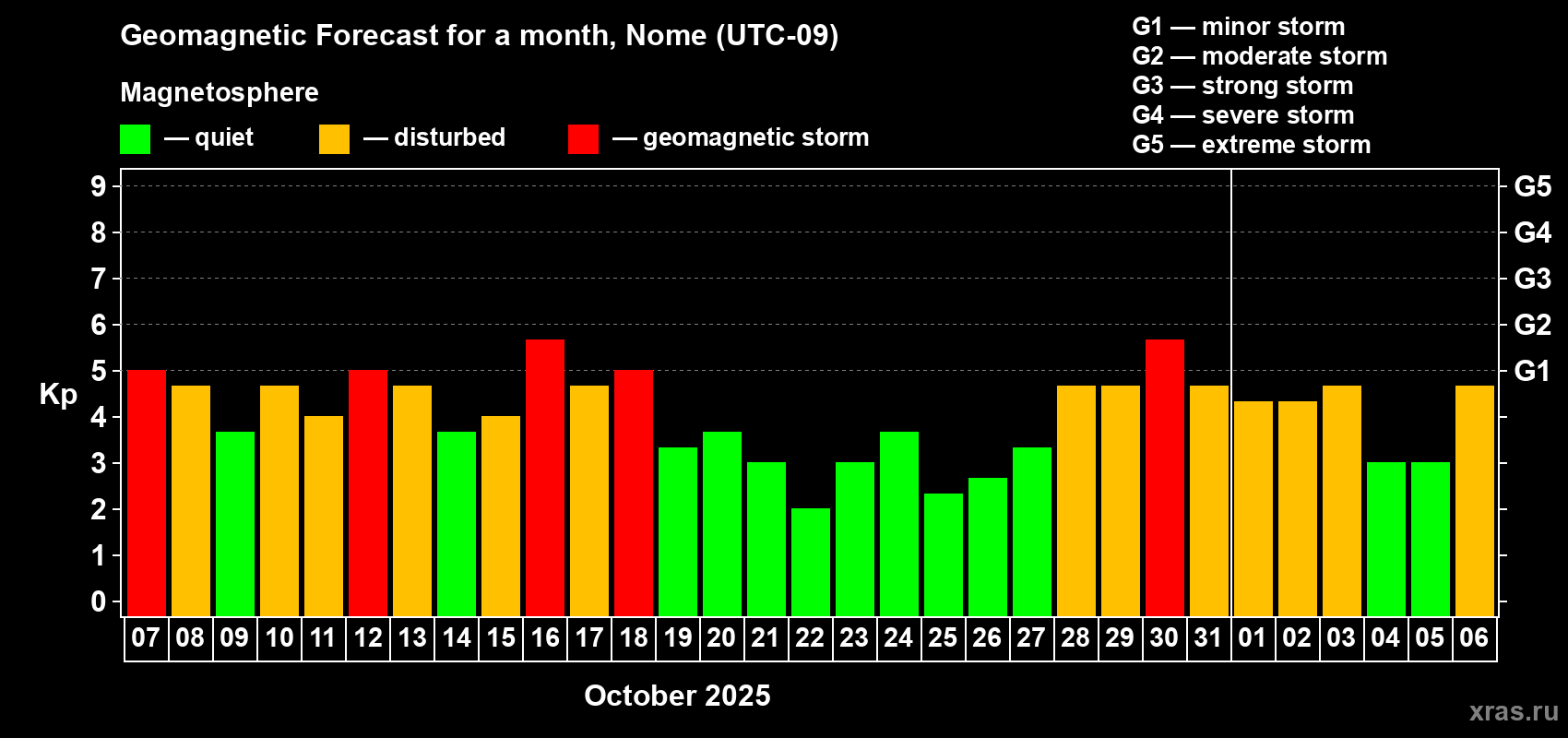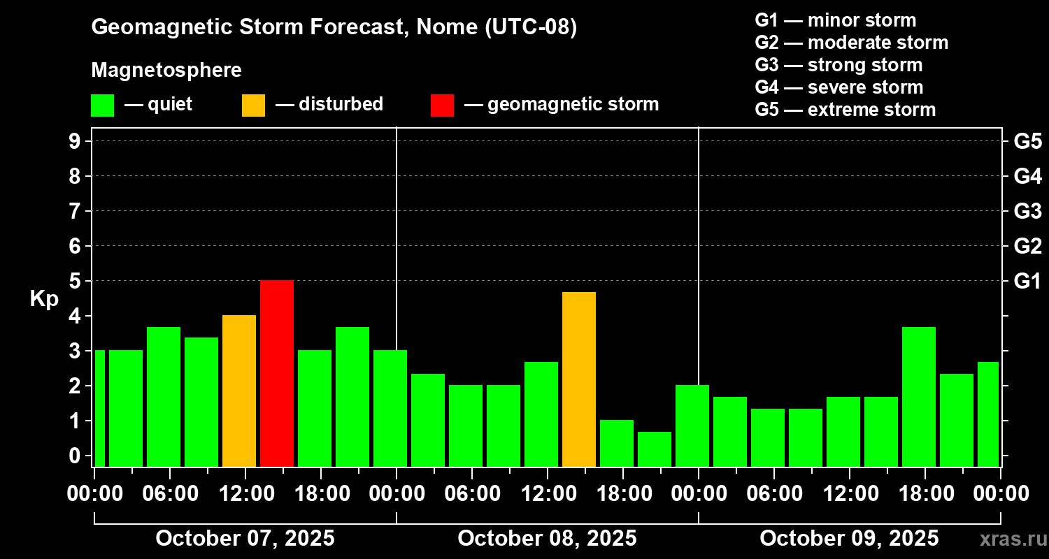 Geomagnetic storm forecast in Nome for Oct 07, 2025