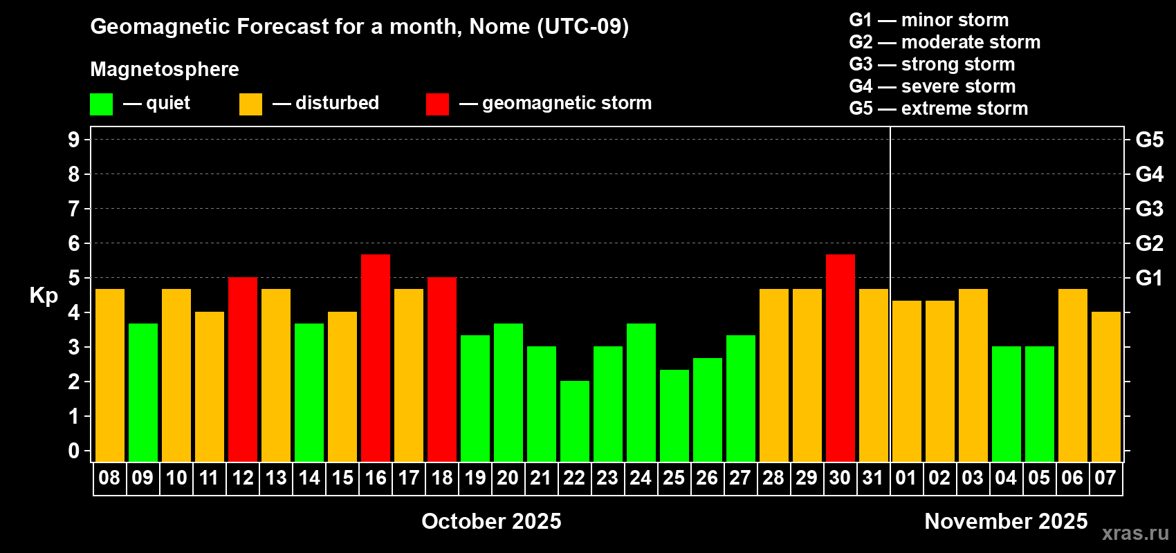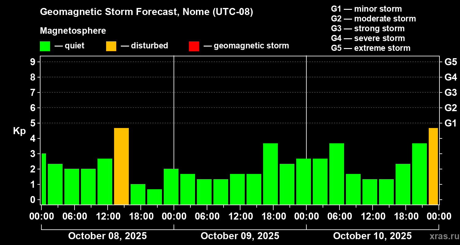 Geomagnetic storm forecast in Nome for Oct 08, 2025