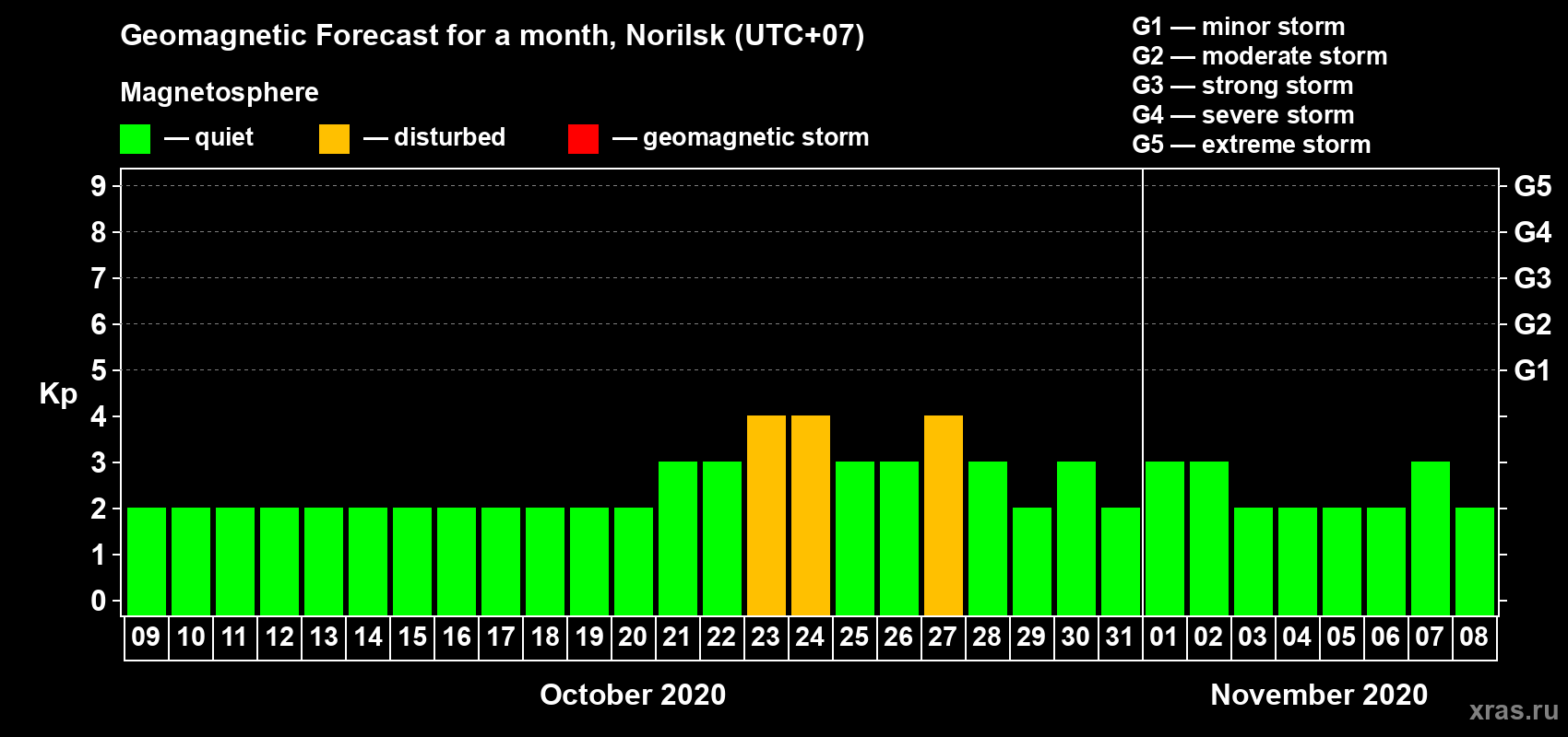 Geomagnetic storm forecast in Norilsk for Oct 09, 2020