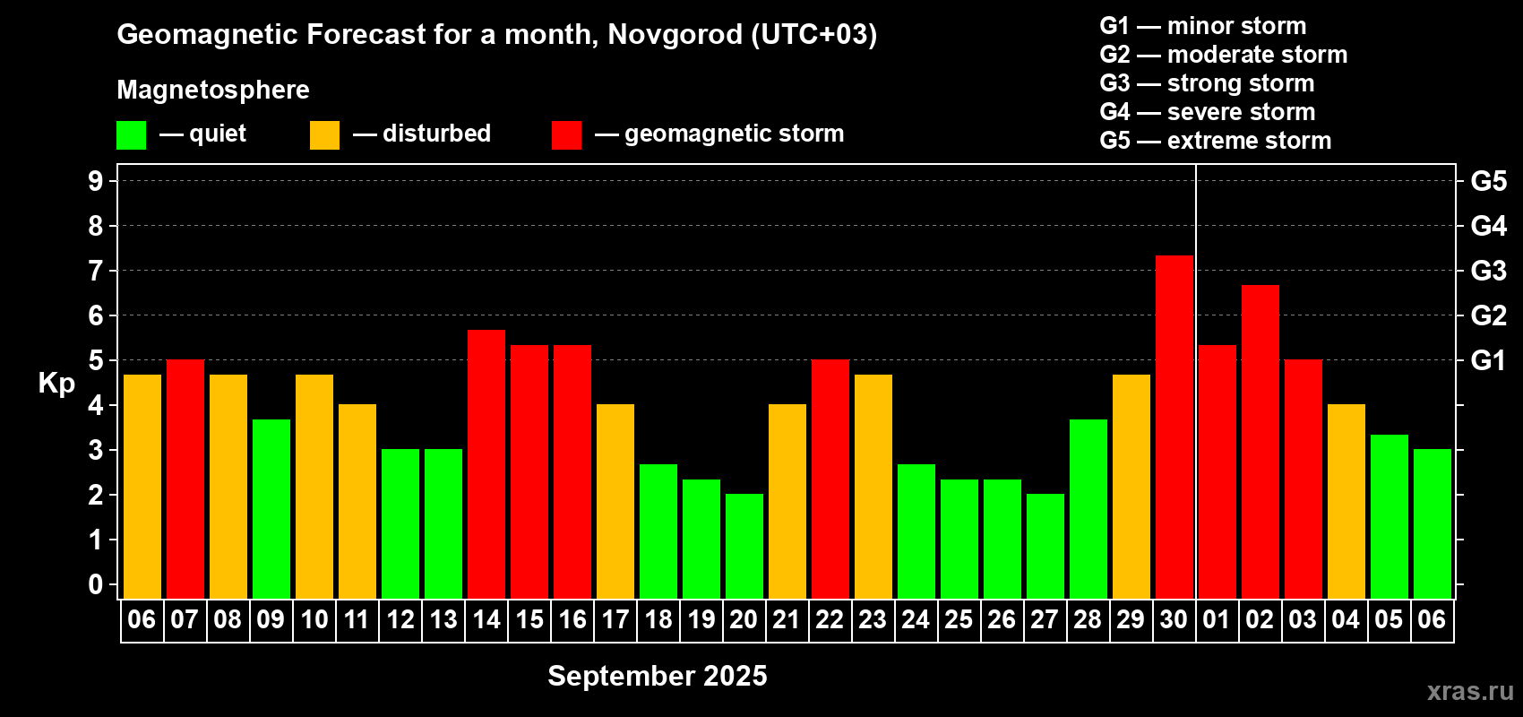 Geomagnetic storm forecast in Novgorod for Sep 06, 2025