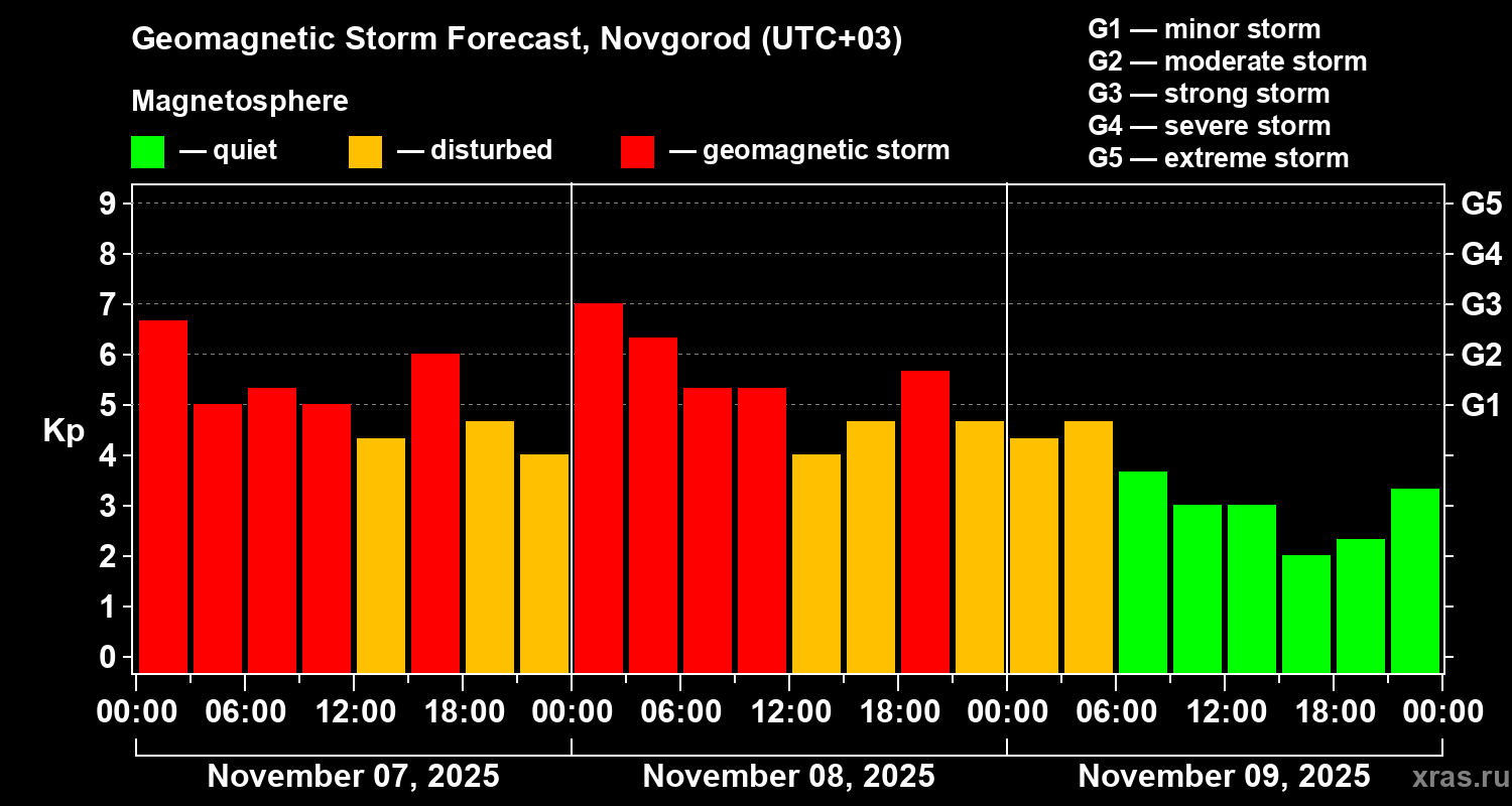 Geomagnetic storm forecast in Novgorod for Nov 07, 2025