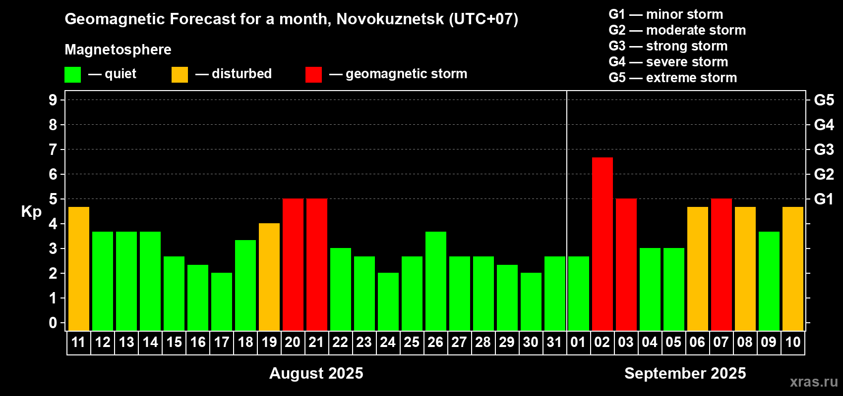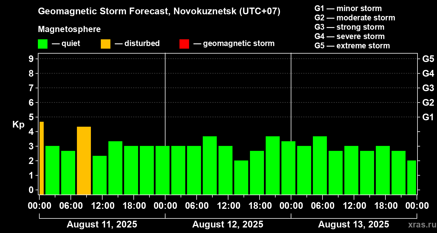Geomagnetic storm forecast in Novokuznetsk for Aug 11, 2025