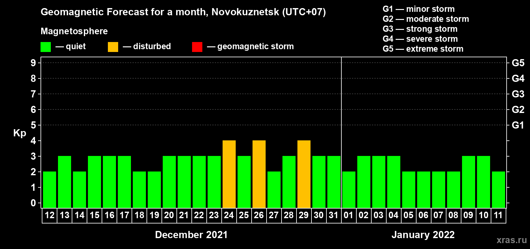 Geomagnetic activity forecast in Novokuznetsk — Dec 12, 2021