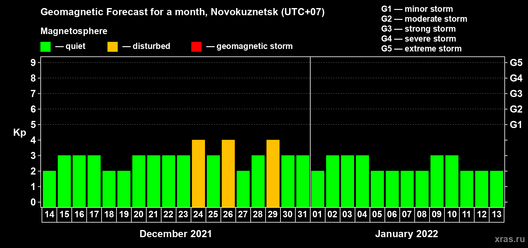 Geomagnetic storm forecast in Novokuznetsk for Dec 14, 2021