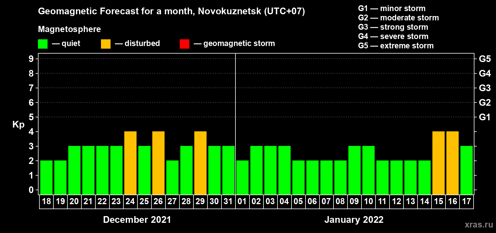 Geomagnetic storm forecast in Novokuznetsk for Dec 18, 2021
